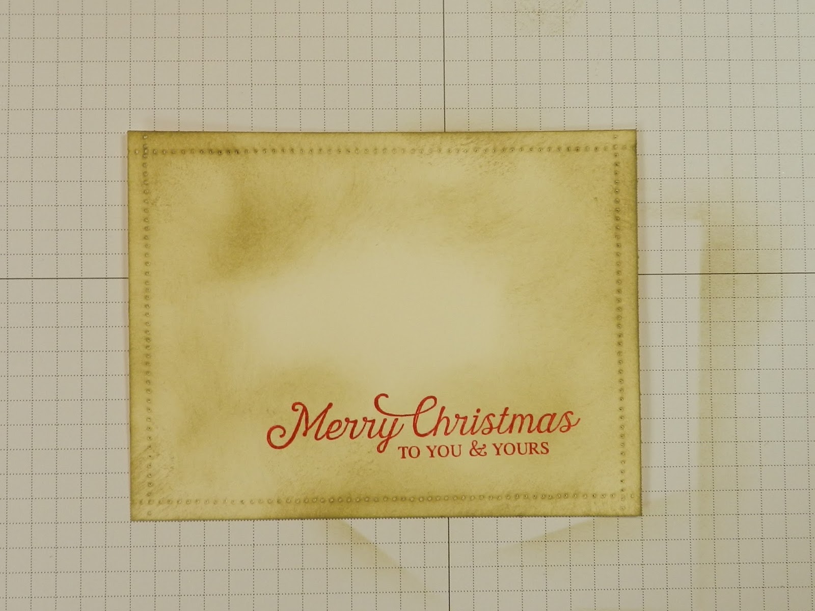 5. Using Real Red ink and the Merry Christmas sentiment stamp from Six Sayings, stamp the sentiment in the lower right hand corner of the panel.